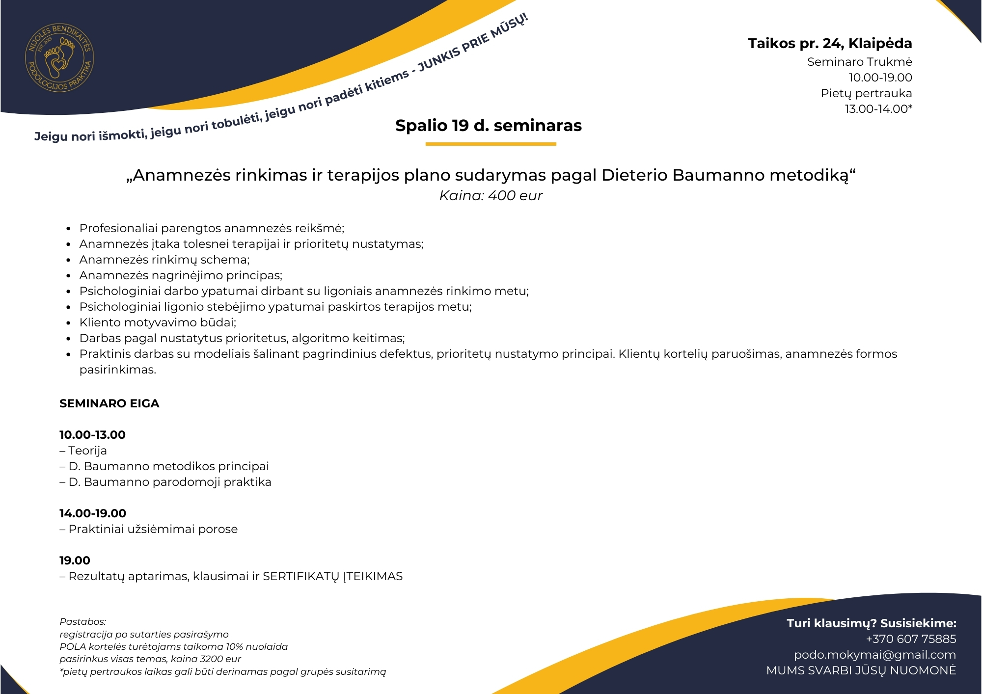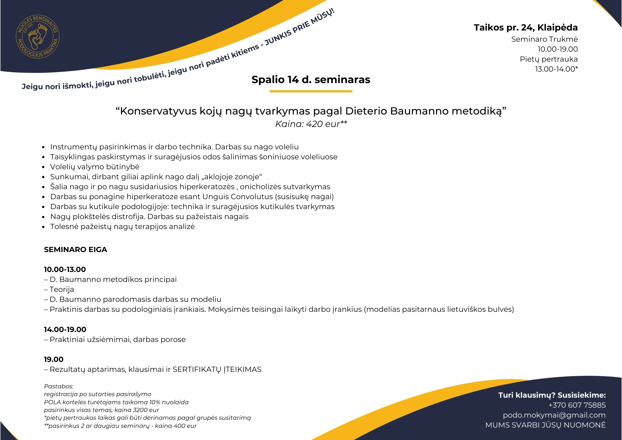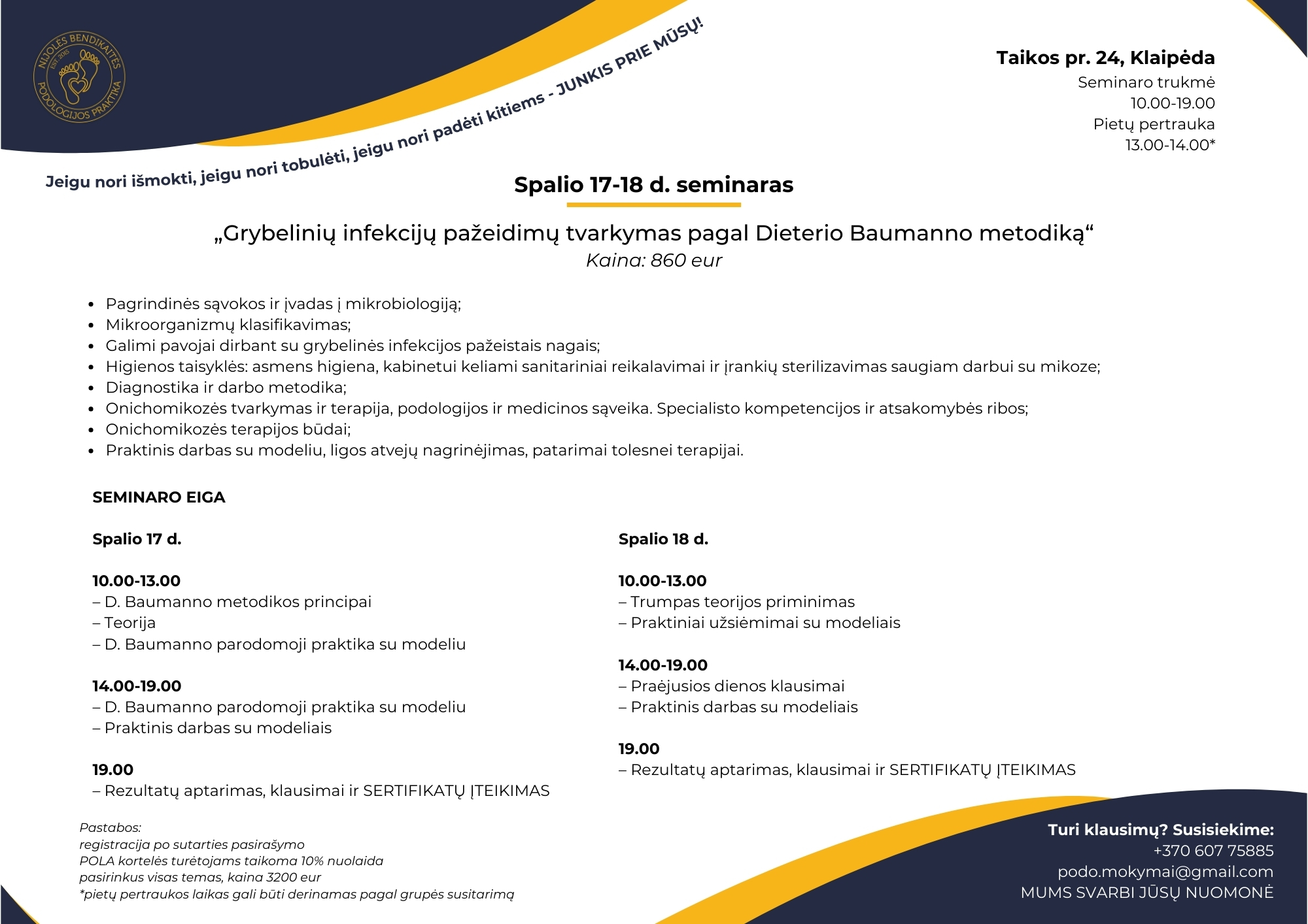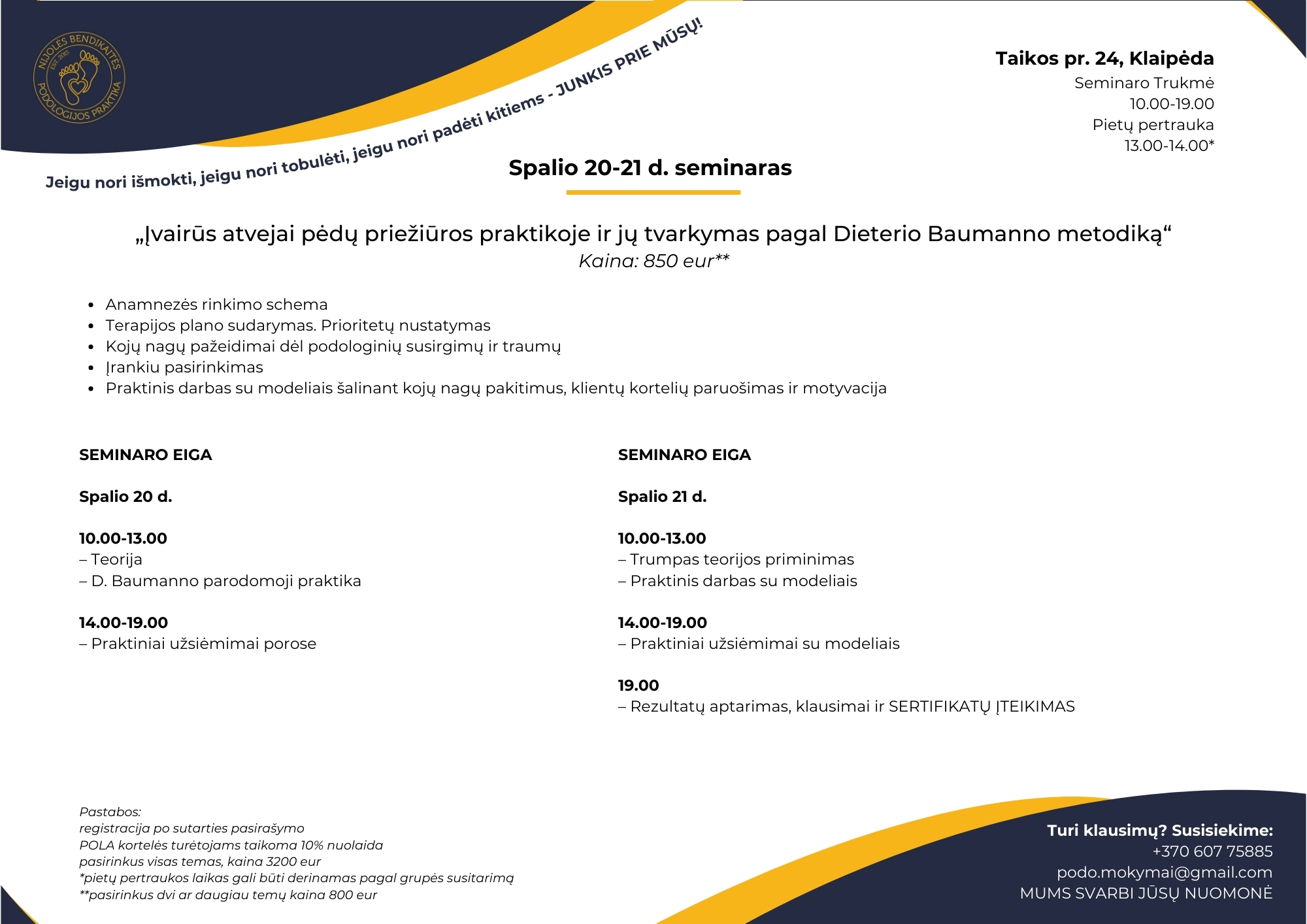 Mokymuose jūs ne tik išgirsite teorinę medžiagą, bet ir pamatysite praktinius darbus sprendžiant įvairias pėdų priežiūros problemas. Turėsite galimybę užduoti visus savo klausimus ir gauti išsamius atsakymus iš mūsų mentorių.